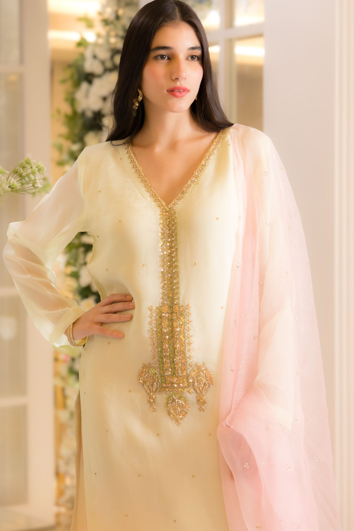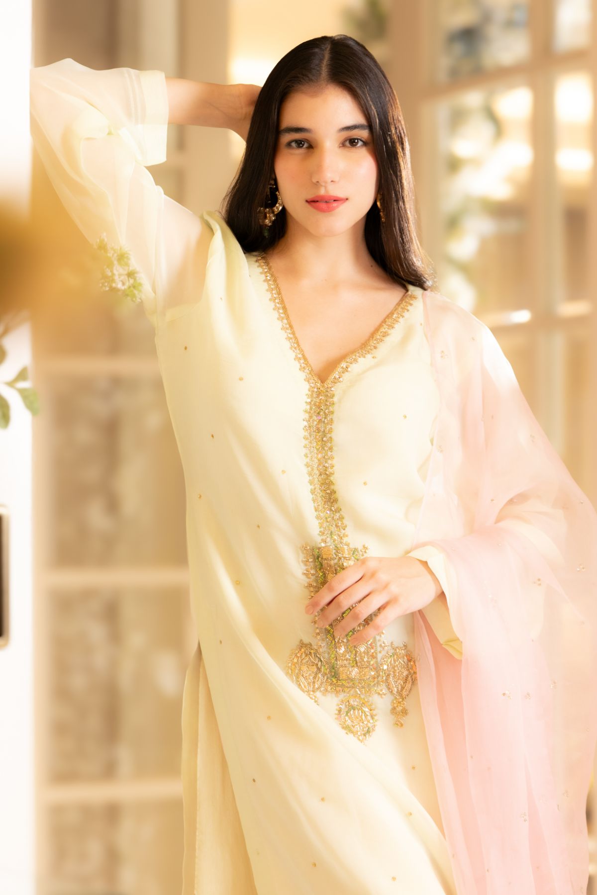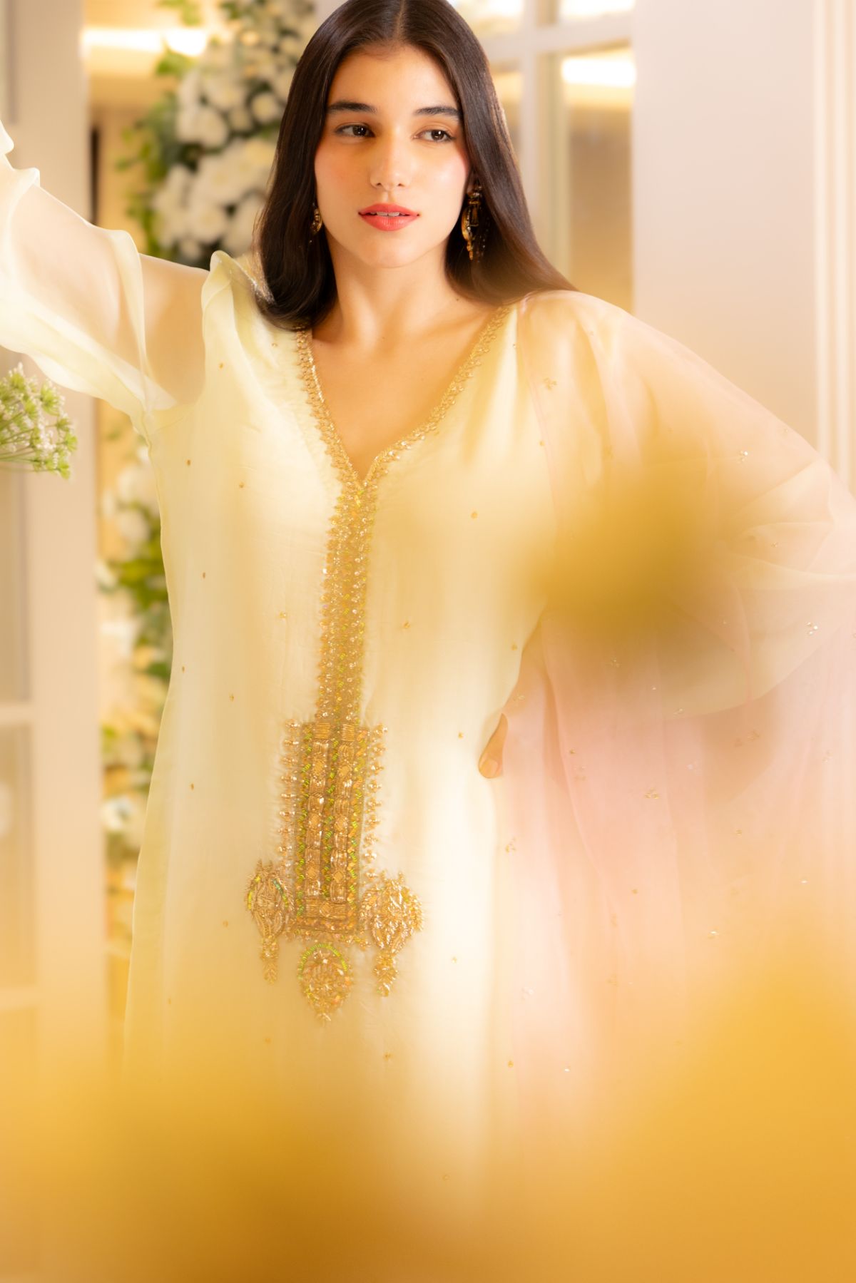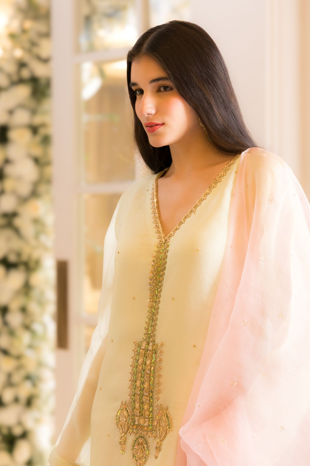 This is a glamorous organza kurta in beautiful pale yellow. The shimmery sequins add a glam-value to the kurta. The hand embroidered kurta is loaded with shimmery sequins that are sparkly yet so understated at the same time. Can be worn both during day/night functions. Paired best with light pink pants and a light pink dupatta.
