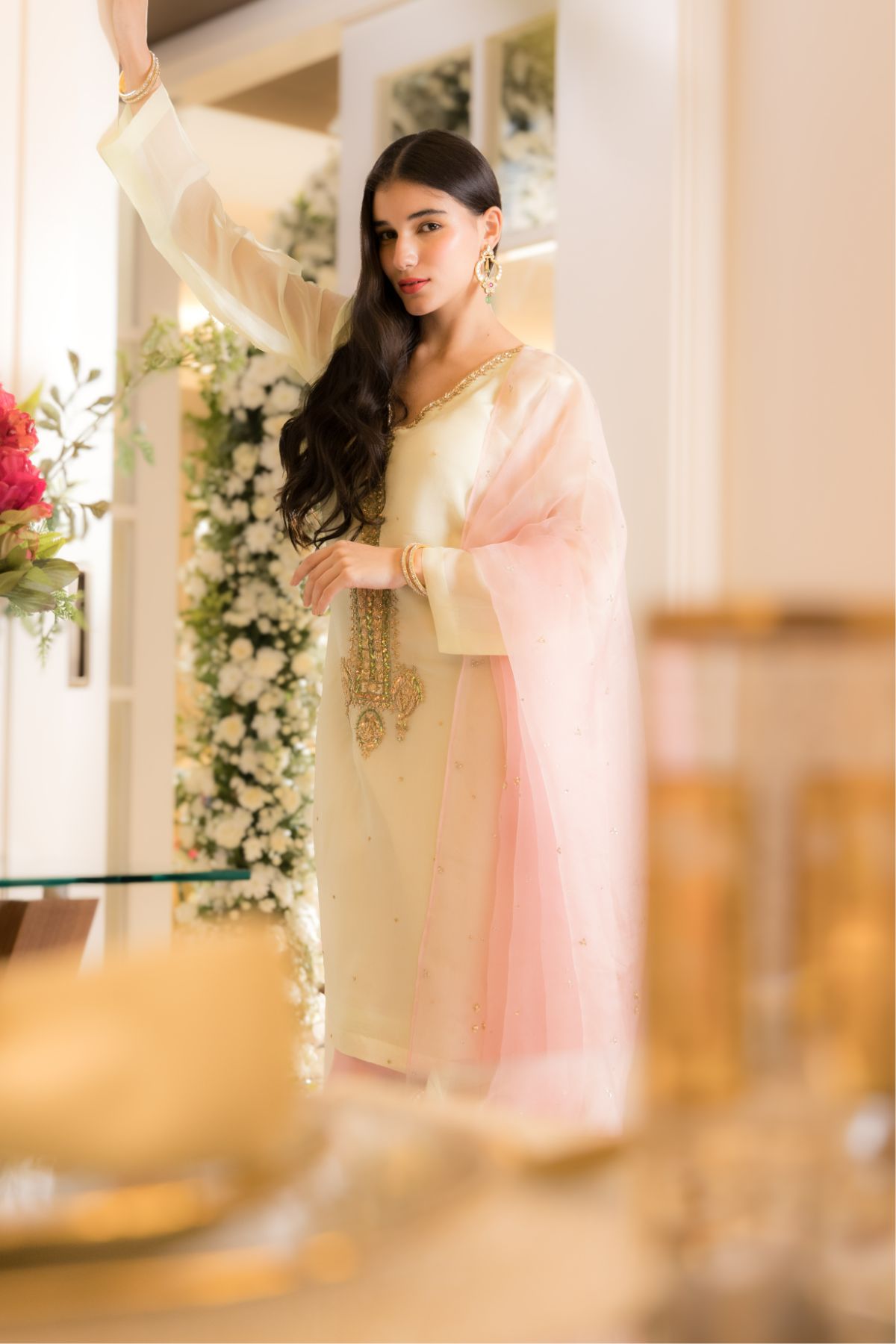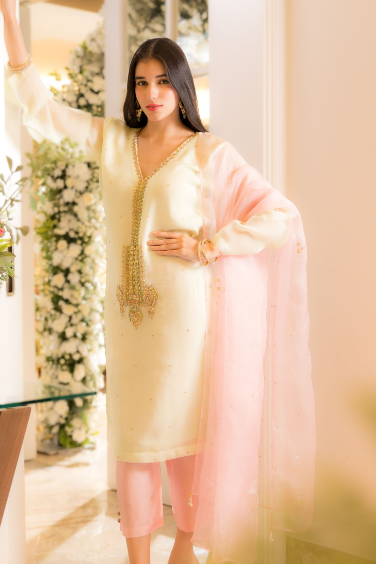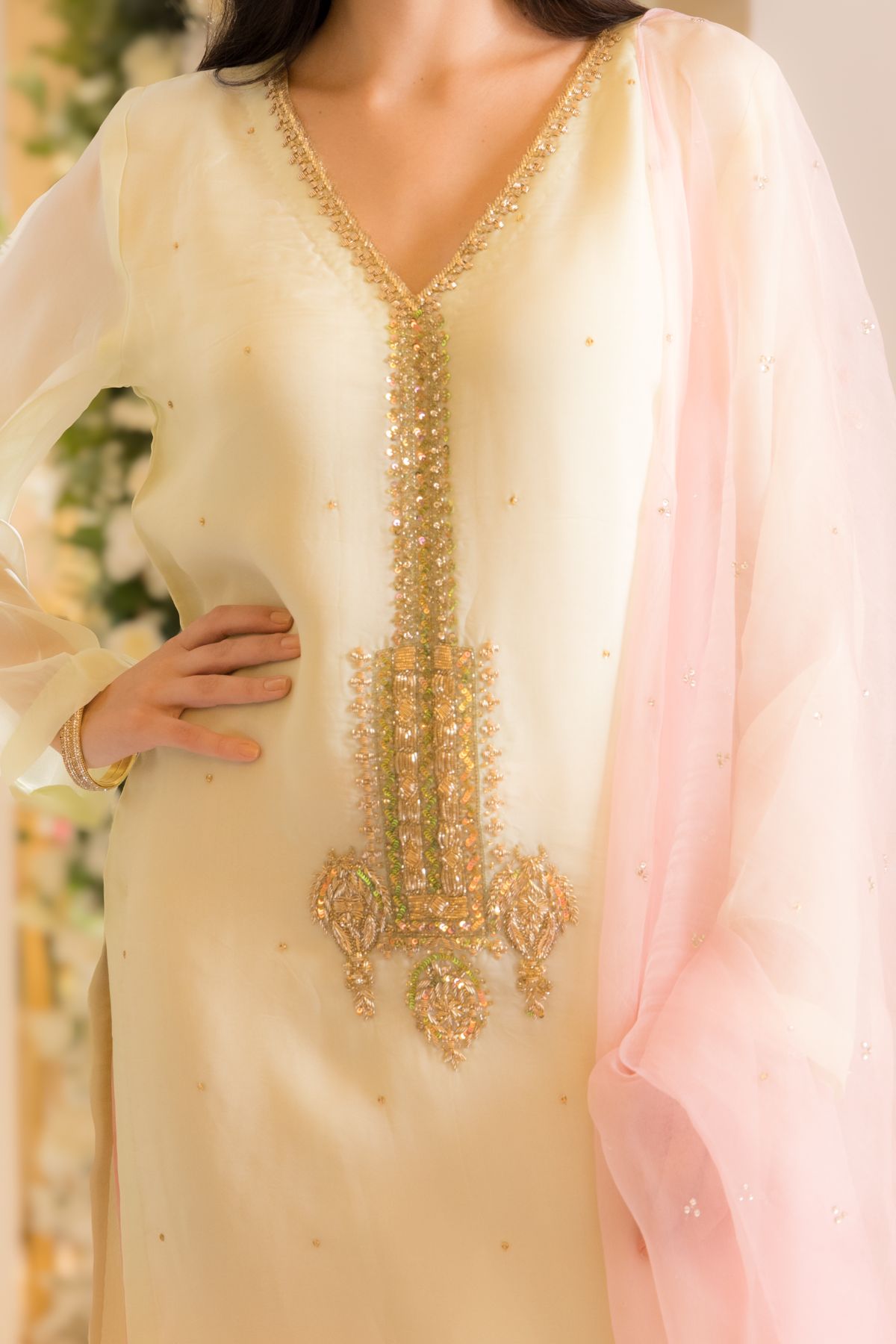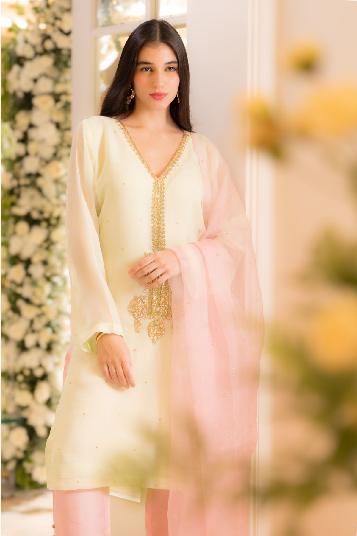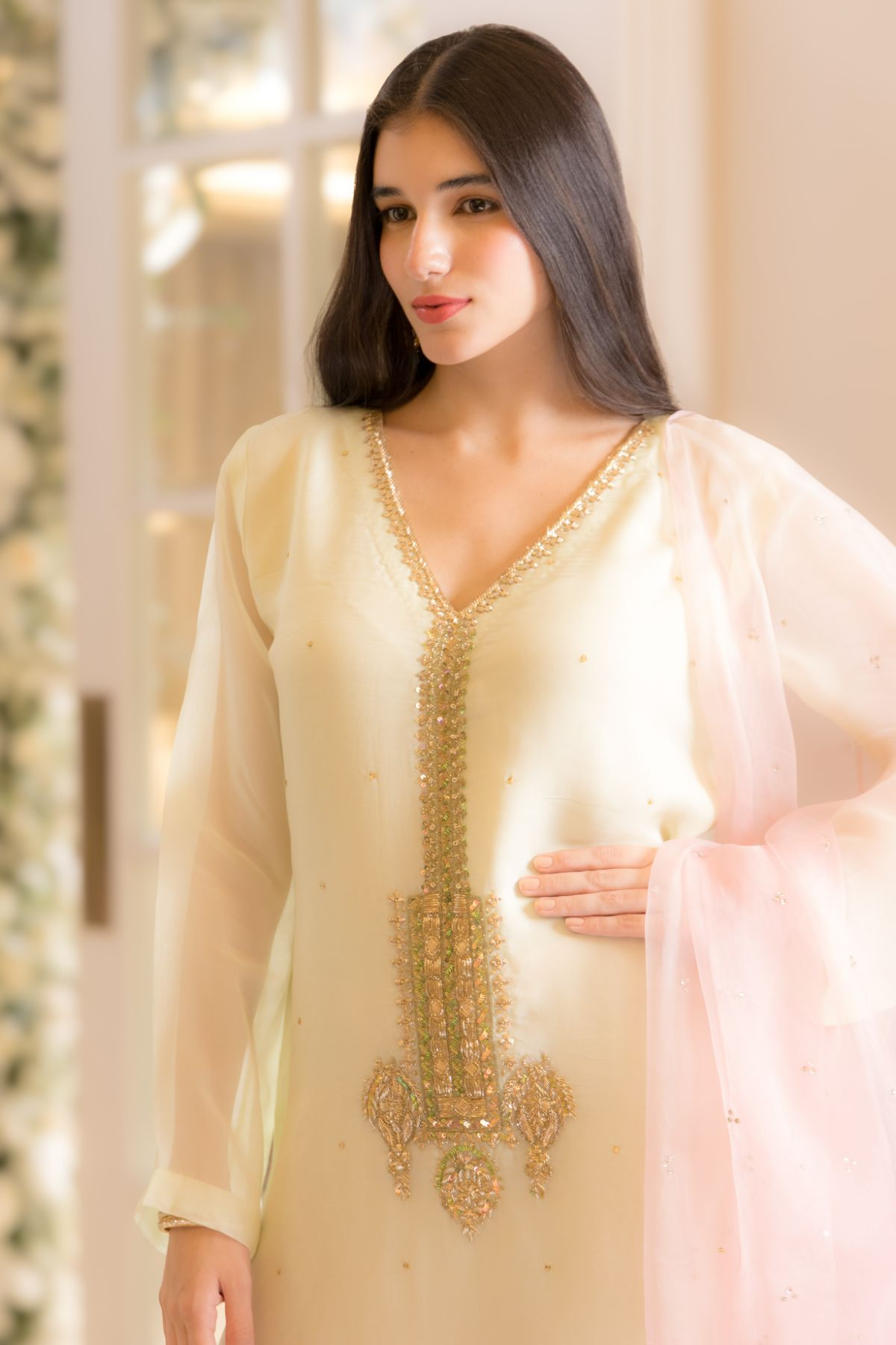 This is a glamorous organza kurta in beautiful pale yellow. The shimmery sequins add a glam-value to the kurta. The hand embroidered kurta is loaded with shimmery sequins that are sparkly yet so understated at the same time. Can be worn both during day/night functions. Paired best with light pink pants and a light pink dupatta.