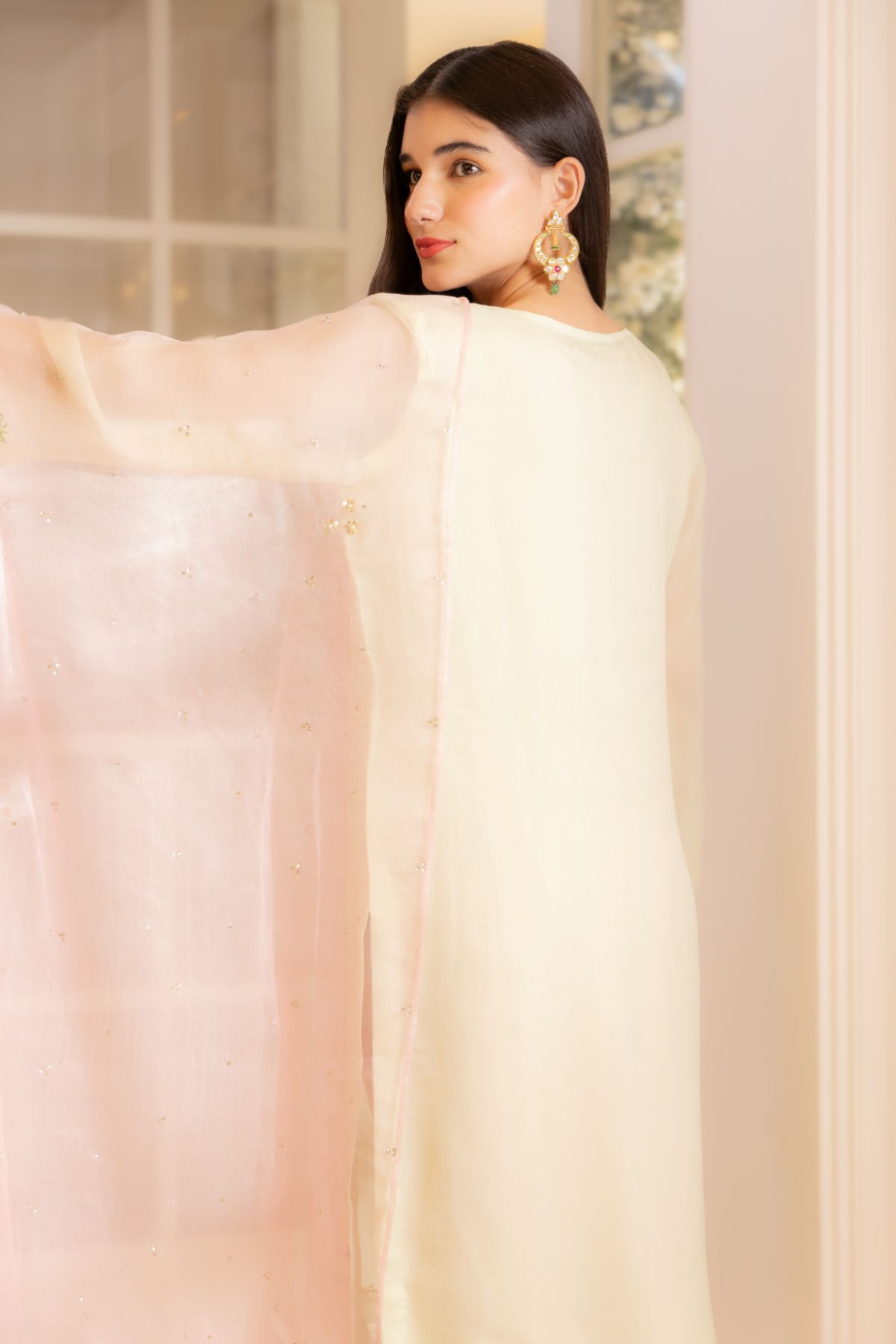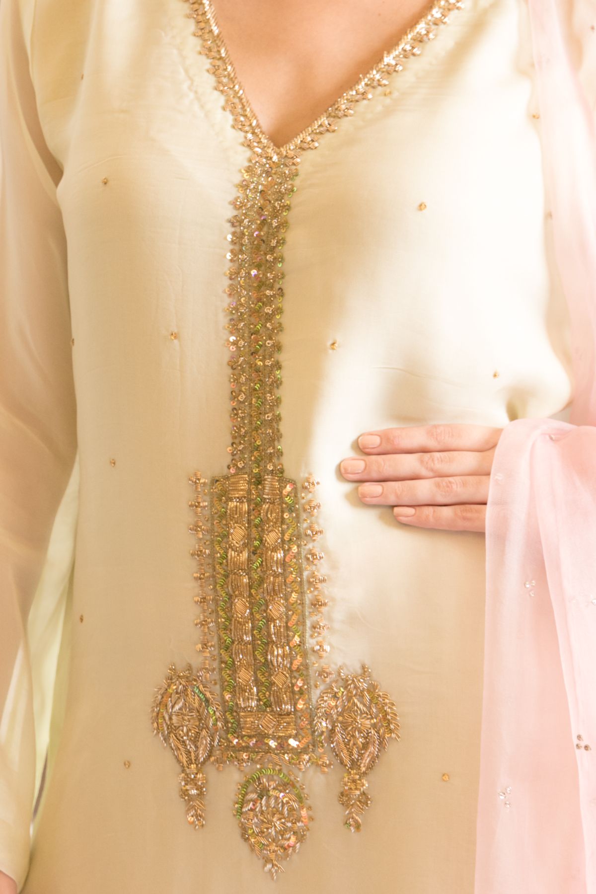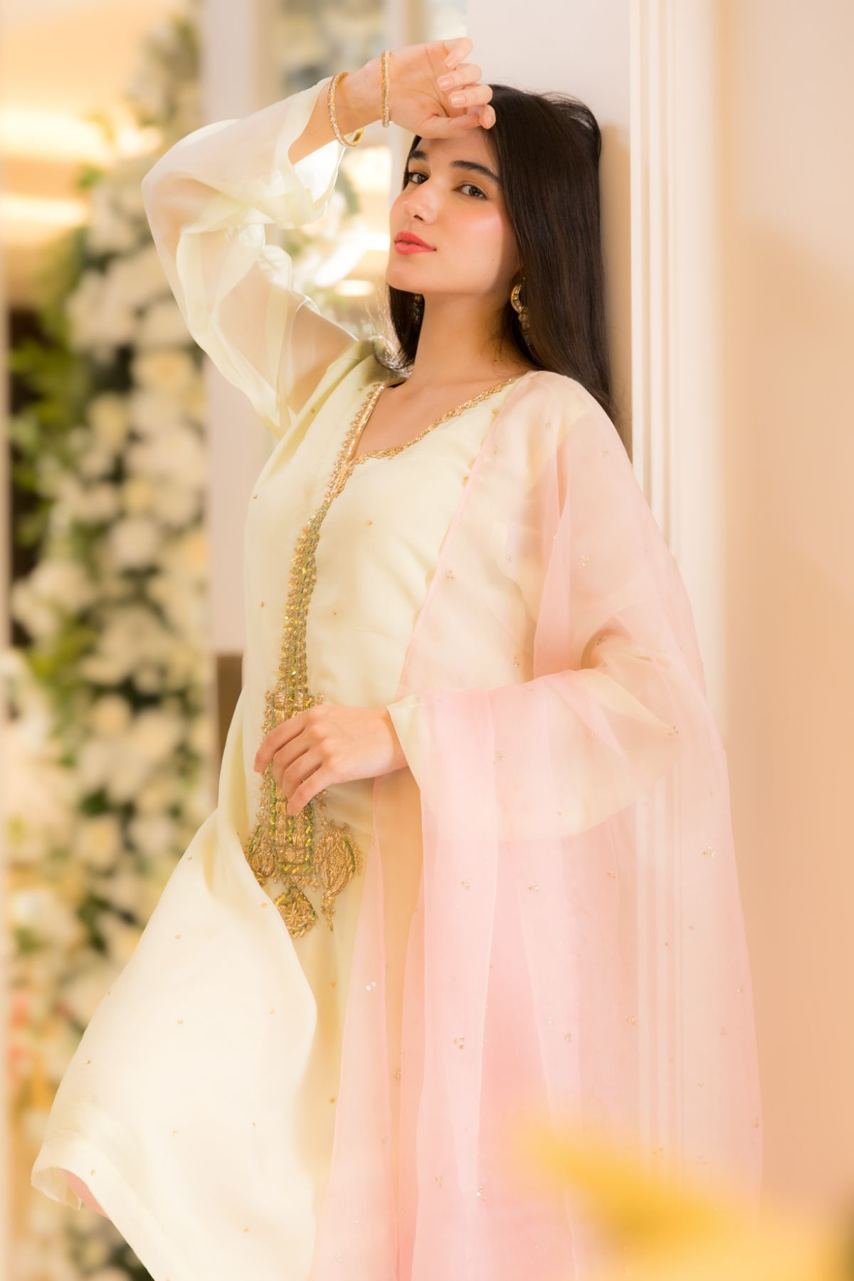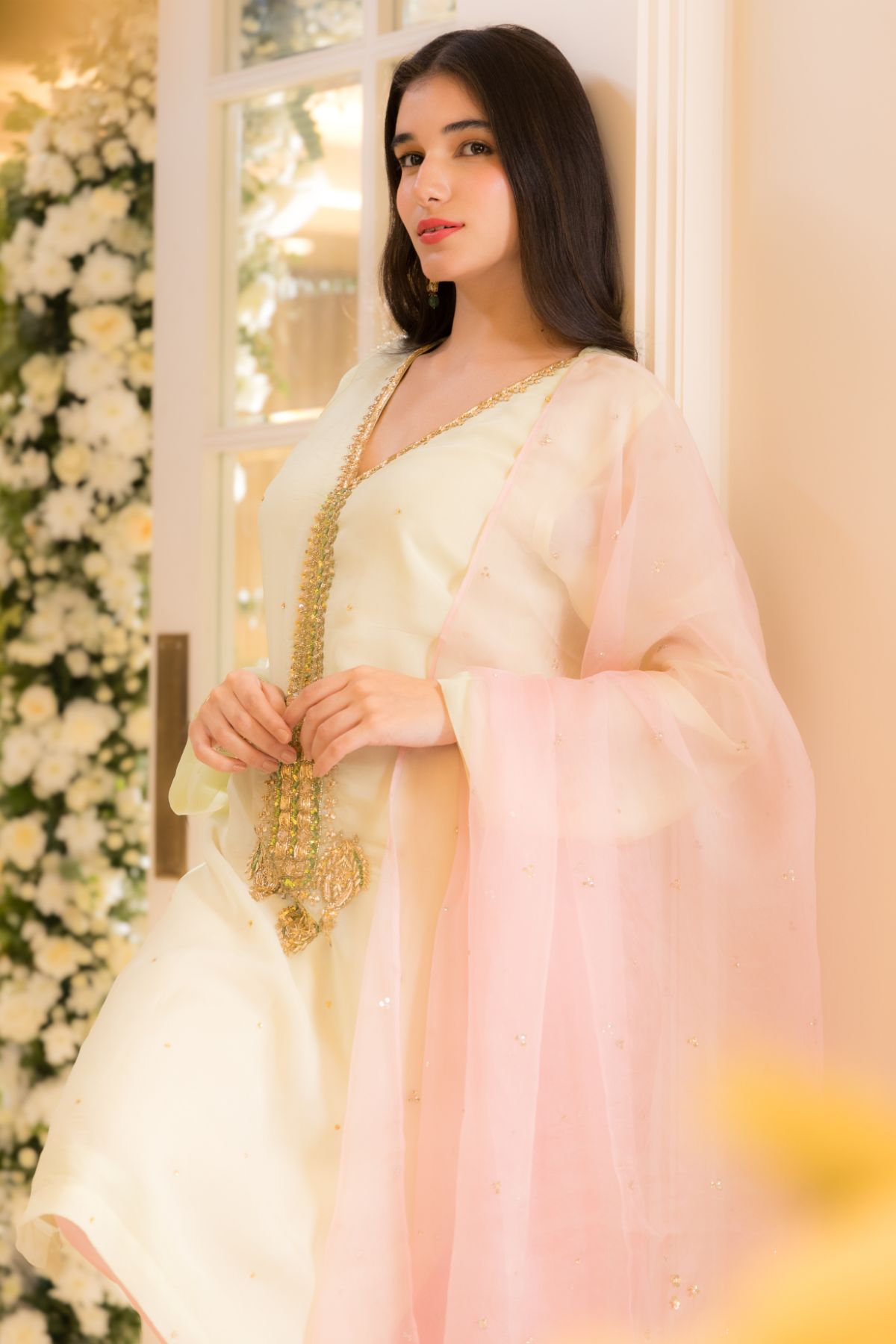 This is a glamorous organza kurta in beautiful pale yellow. The shimmery sequins add a glam-value to the kurta. The hand embroidered kurta is loaded with shimmery sequins that are sparkly yet so understated at the same time. Can be worn both during day/night functions. Paired best with light pink pants and a light pink dupatta.