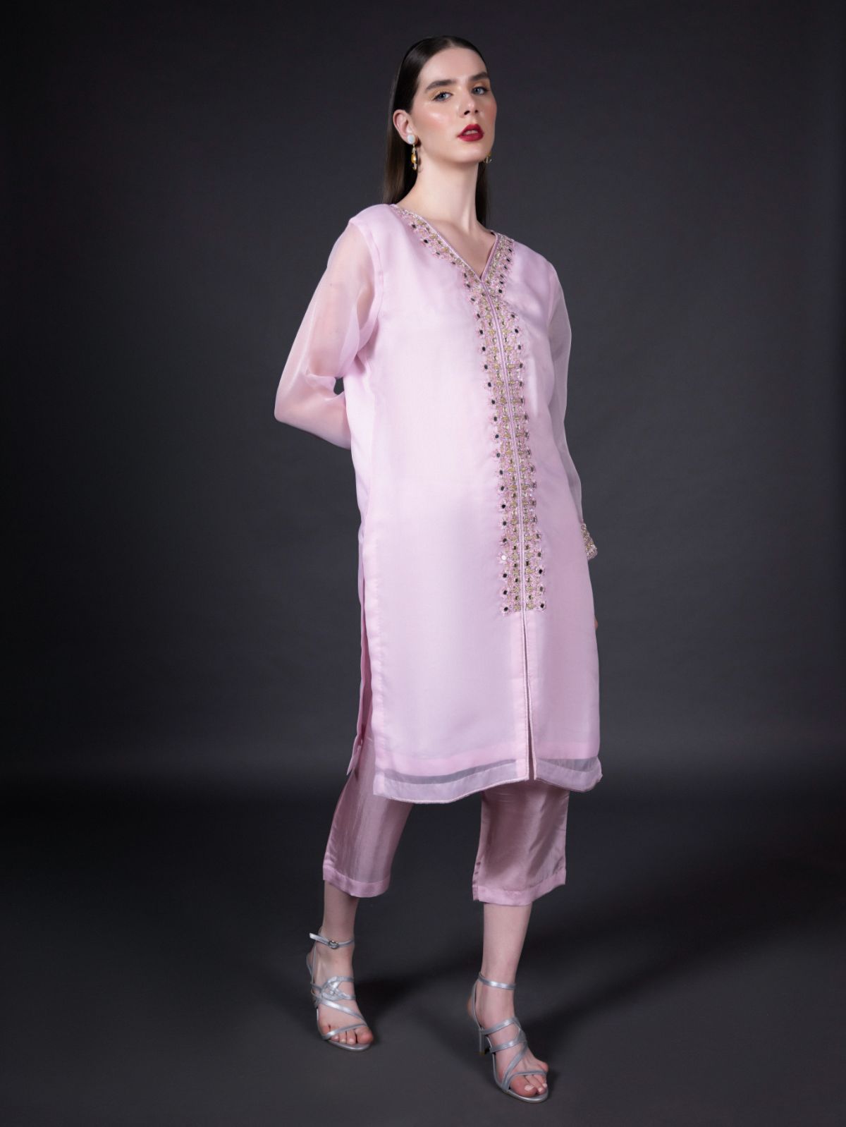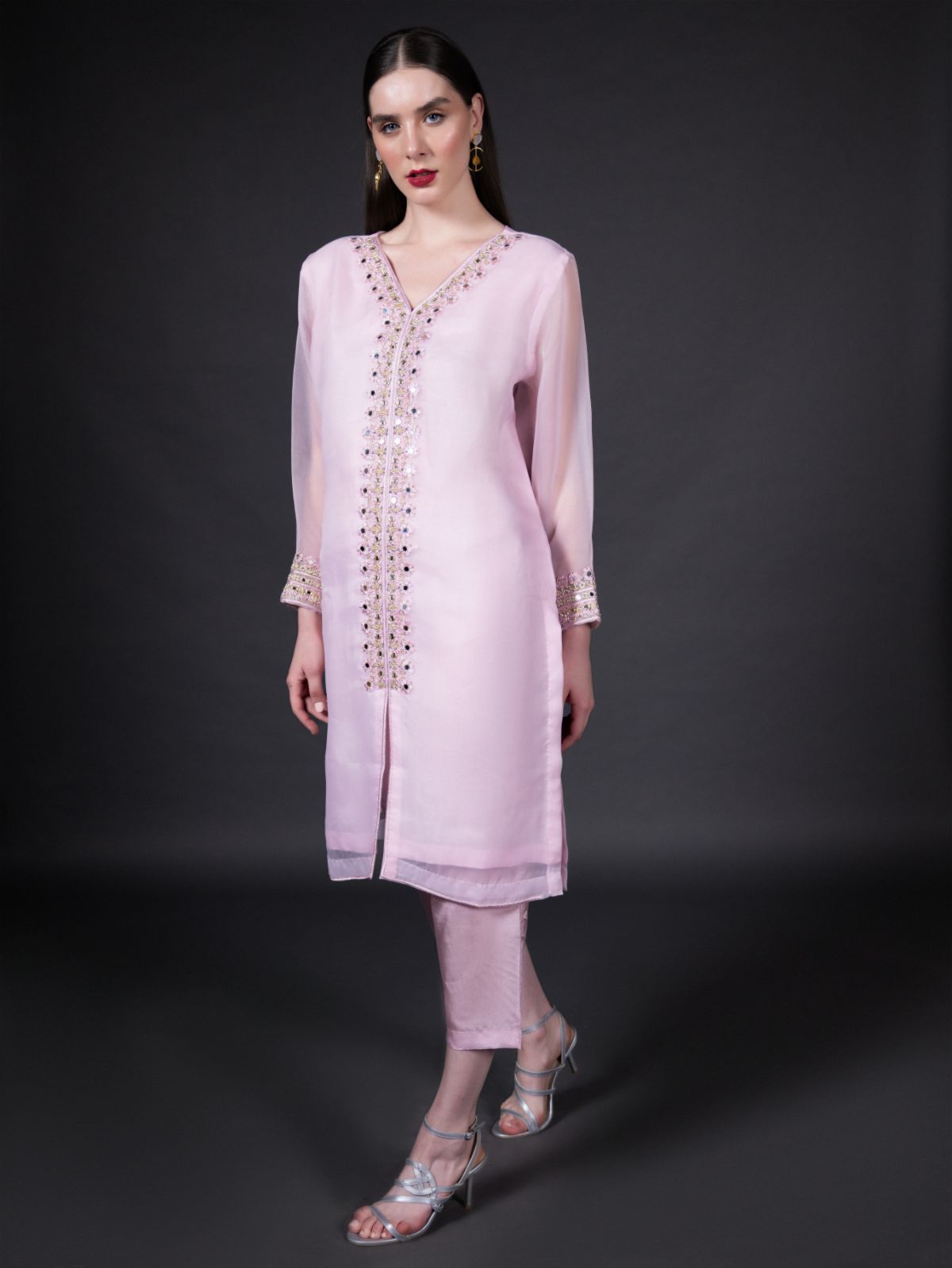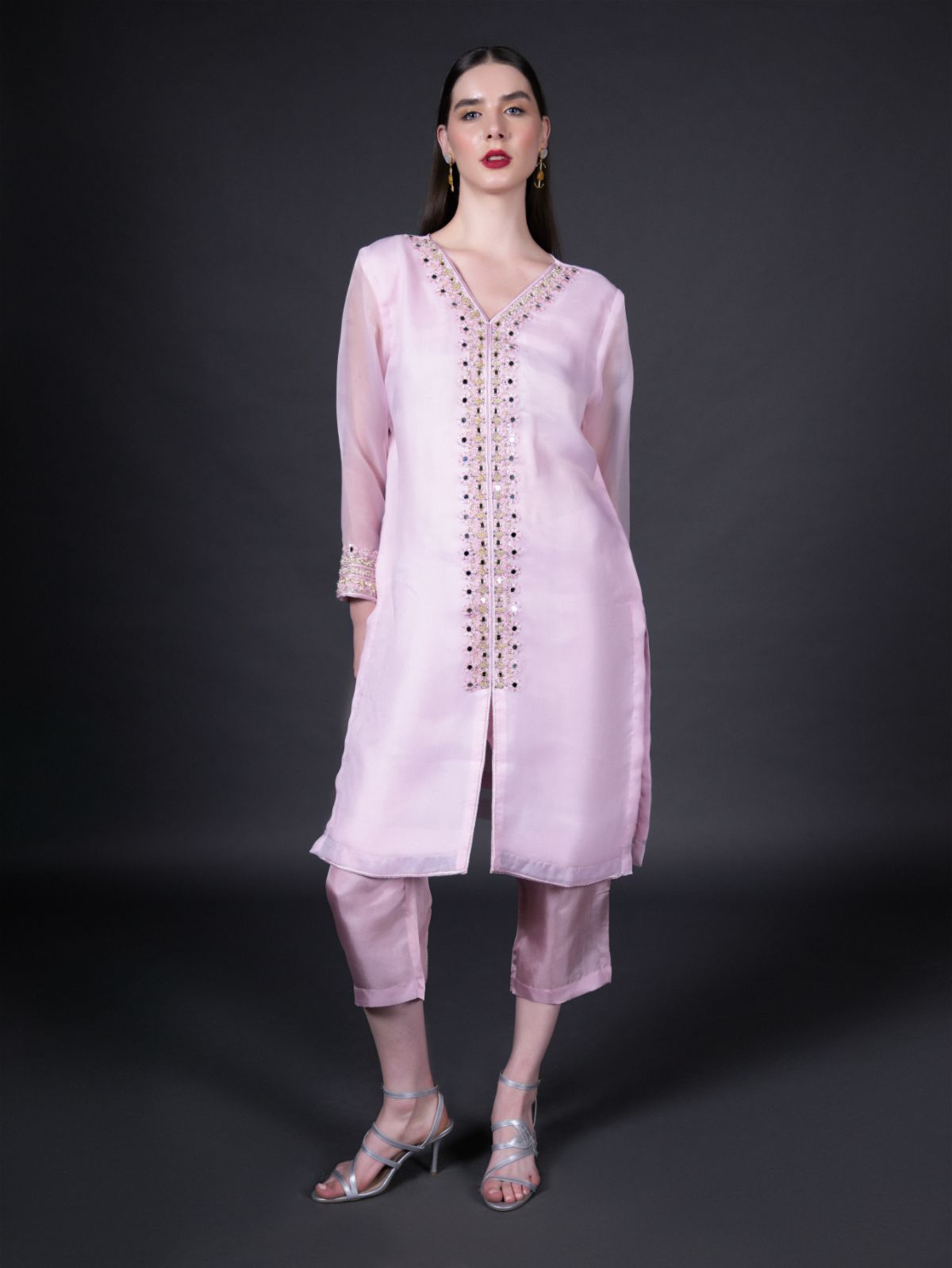 A dreamy pink pearl-organza kurta has fine mirror work done with intricate handcraftsmanship. Heavily adorned with mirrors and fine resham work, this mirror work takes a Karigar anywhere from 24 to 30 hours to create this lovely ensemble. This gorgeous kurta is best worn with its matching pants. The kurta is lovely for both day and evening wear, for light/heavy occasions. It pairs best with a plain dupatta.
