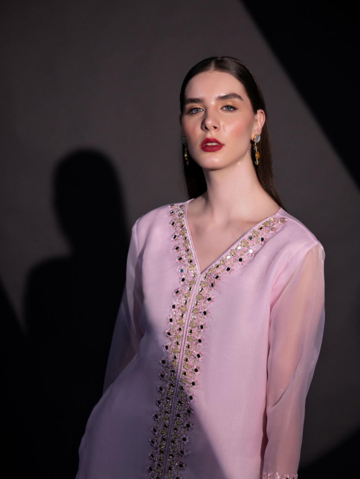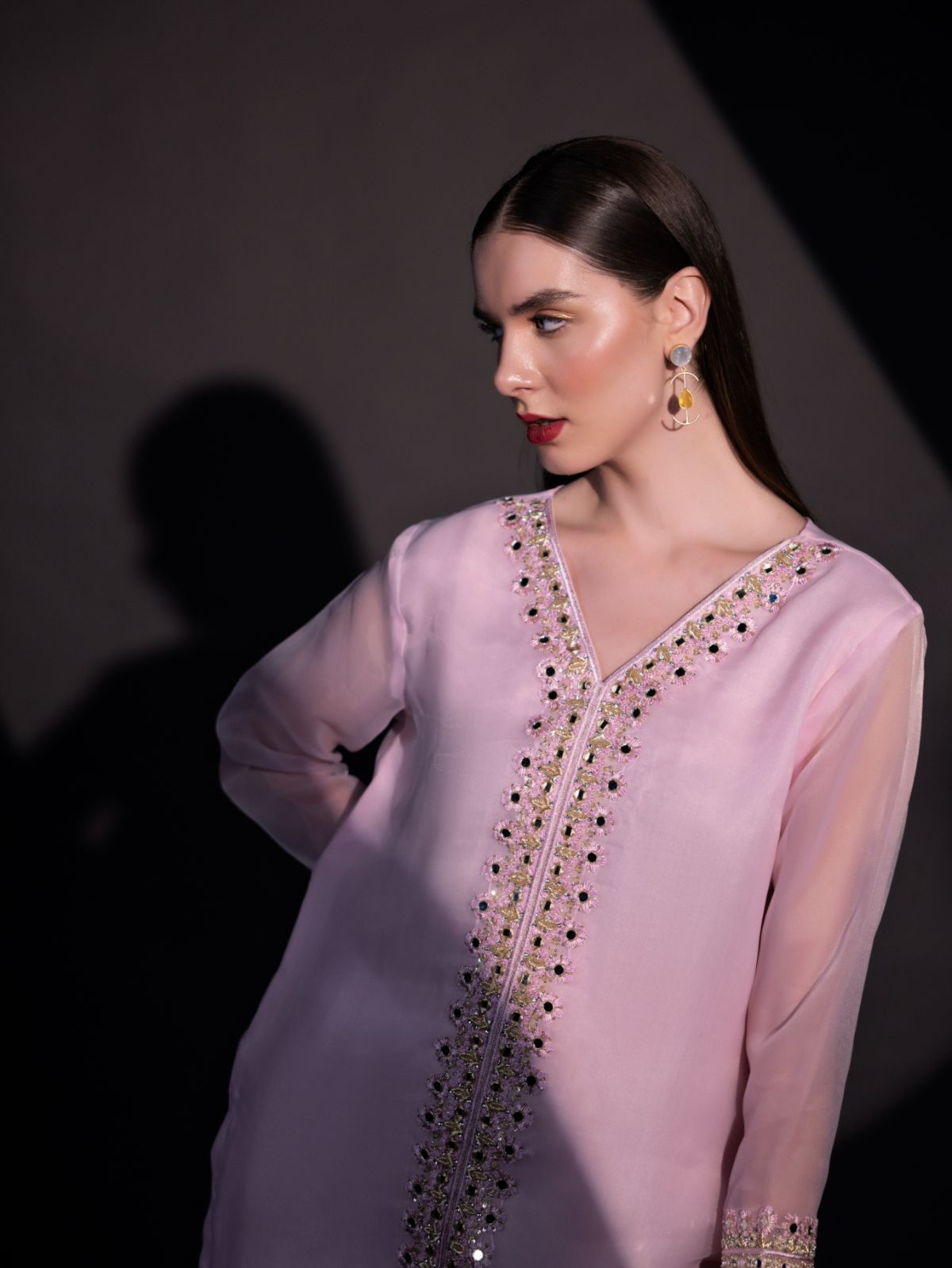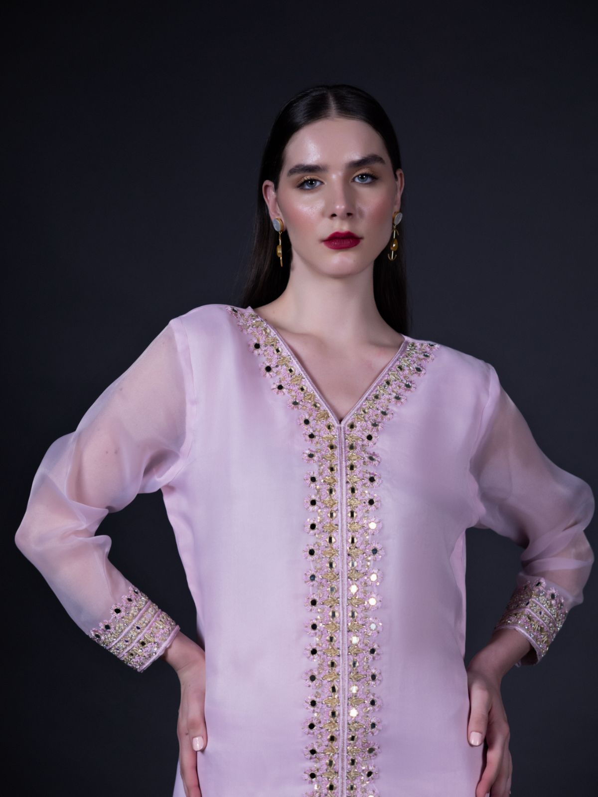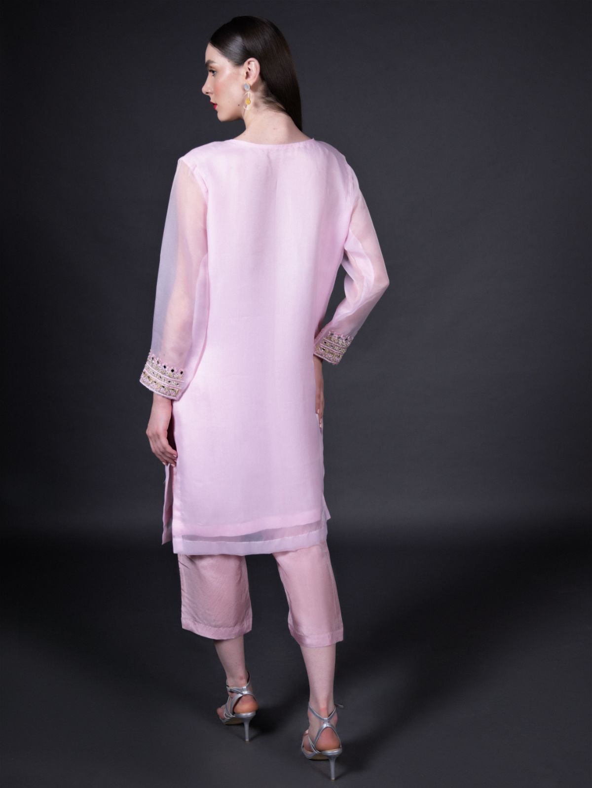 A dreamy pink pearl-organza kurta has fine mirror work done with intricate handcraftsmanship. Heavily adorned with mirrors and fine resham work, this mirror work takes a Karigar anywhere from 24 to 30 hours to create this lovely ensemble. This gorgeous kurta is best worn with its matching pants. The kurta is lovely for both day and evening wear, for light/heavy occasions. It pairs best with a plain dupatta.