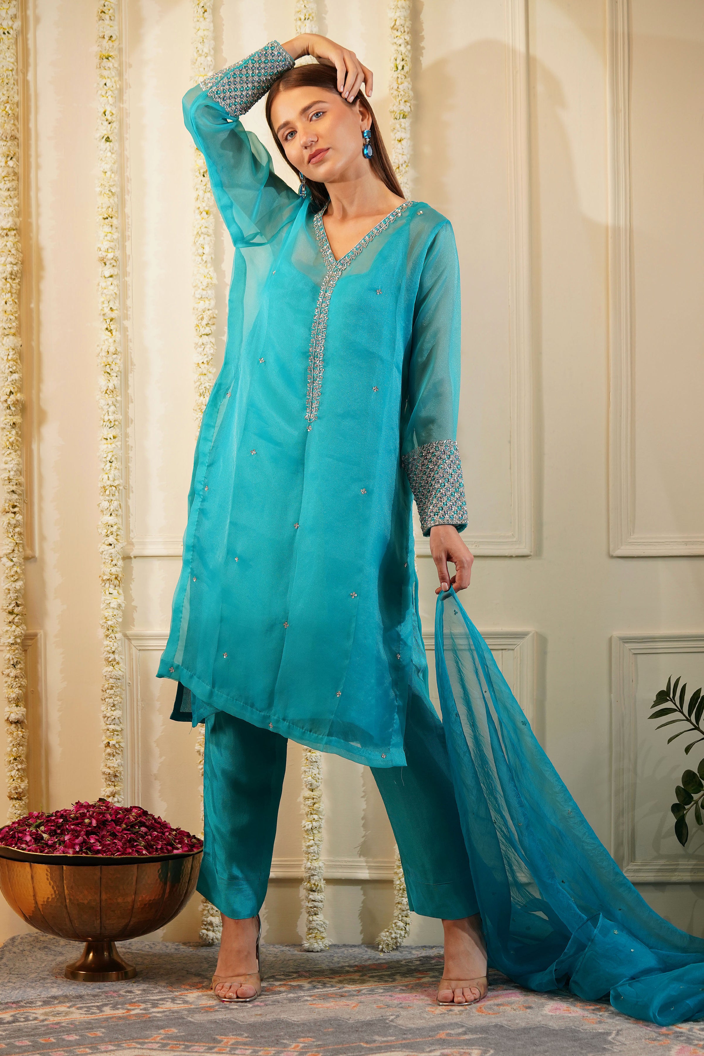 This is a beautiful blue crystal organza kurta that is easy and comfortable and instantly brings elegance and class to the look. The kurta is hand embellished with sequins, naqshi, dabka crystals, and beads. Best paired with a matching hand-work dupatta and pants.