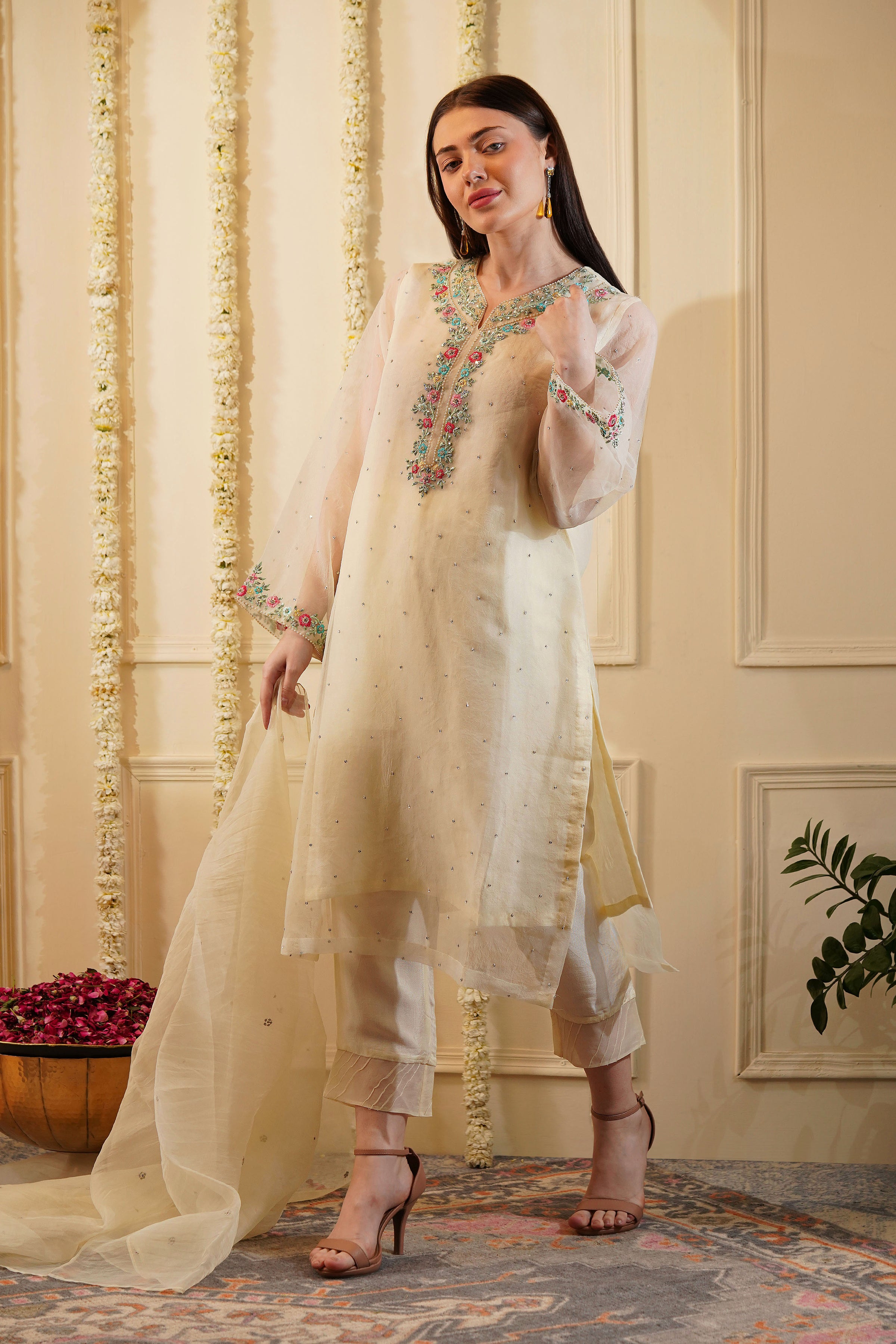 This kurta is hand-embroidered with much care and precision. However, the elements may fall off or tear if not taken care of properly. Avoid using hot iron directly on the embroidery or the organza fabric. Low heat ironing advised. When ironing, it is best to reverse the fabric. Alternately, place a mulmul fabric on top if using hot iron directly on the fabric.
