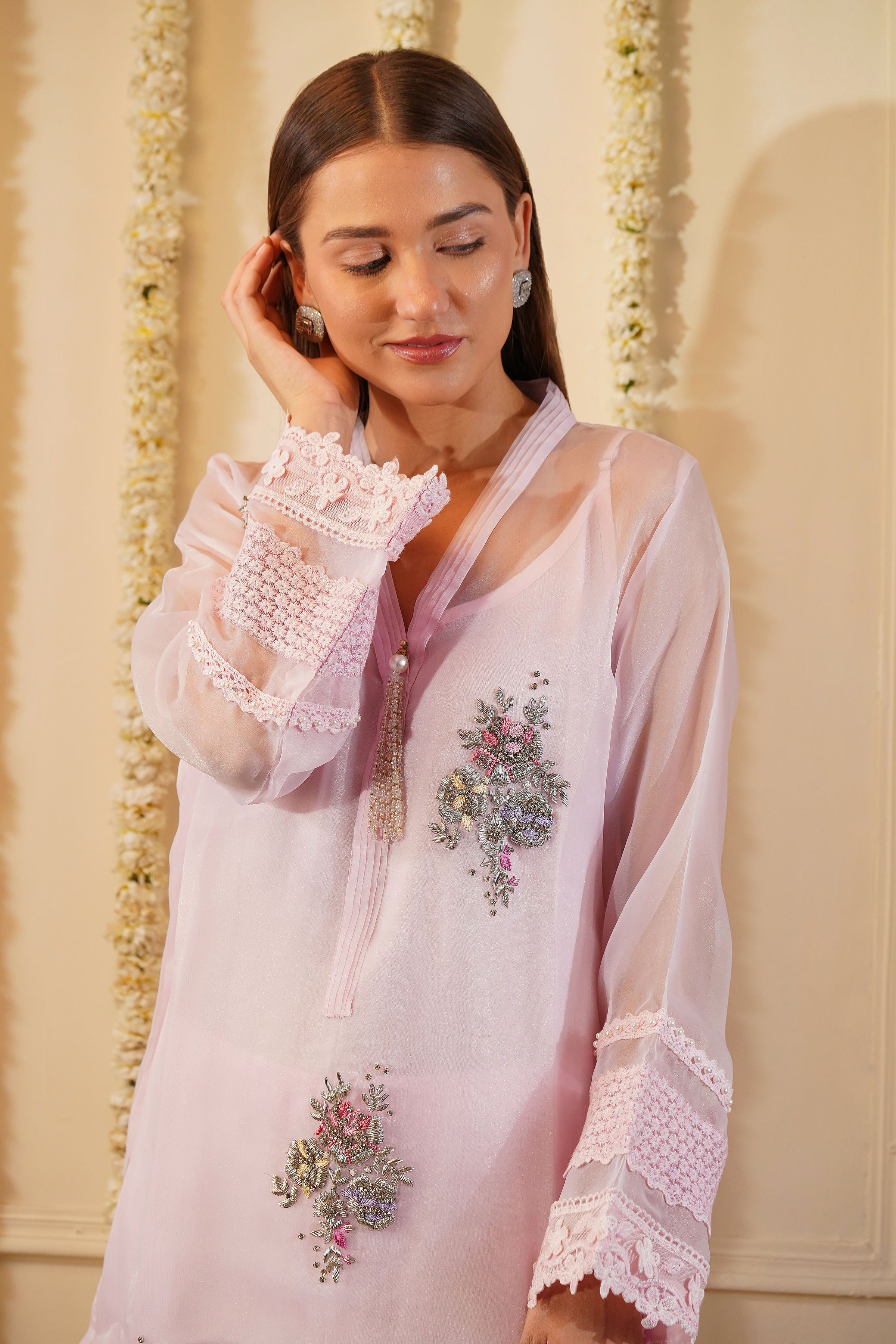 This luxurious, pristine pink kurta exuding elegance and sophistication is hand-embroidered with Resham cut dana sequins and dabka-naqshi work. This elegant piece is paired with soft pink pants.