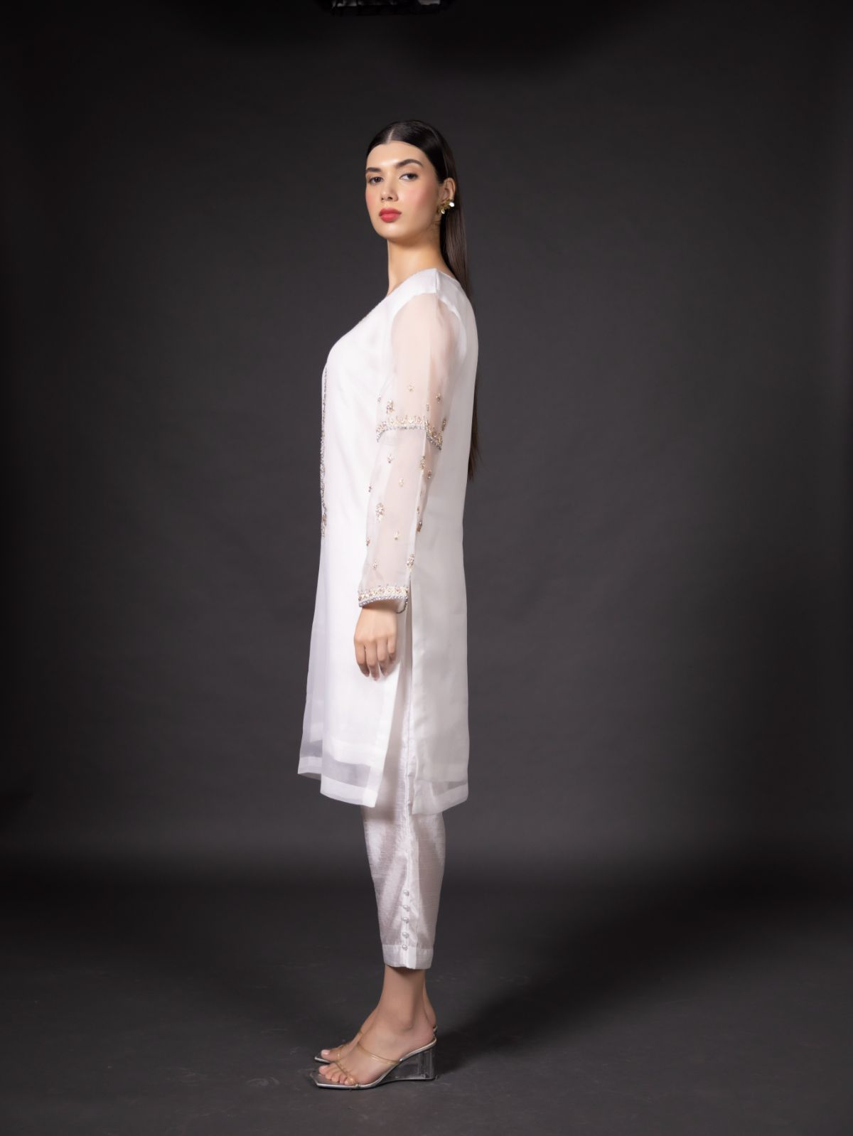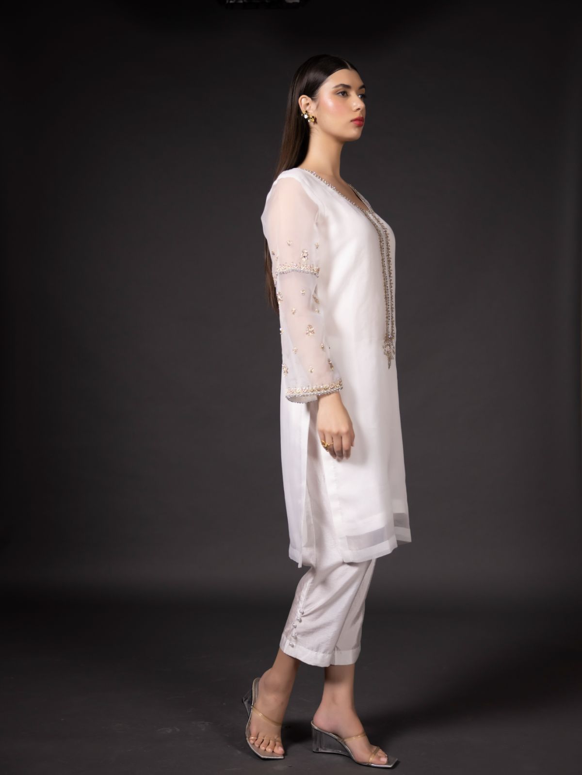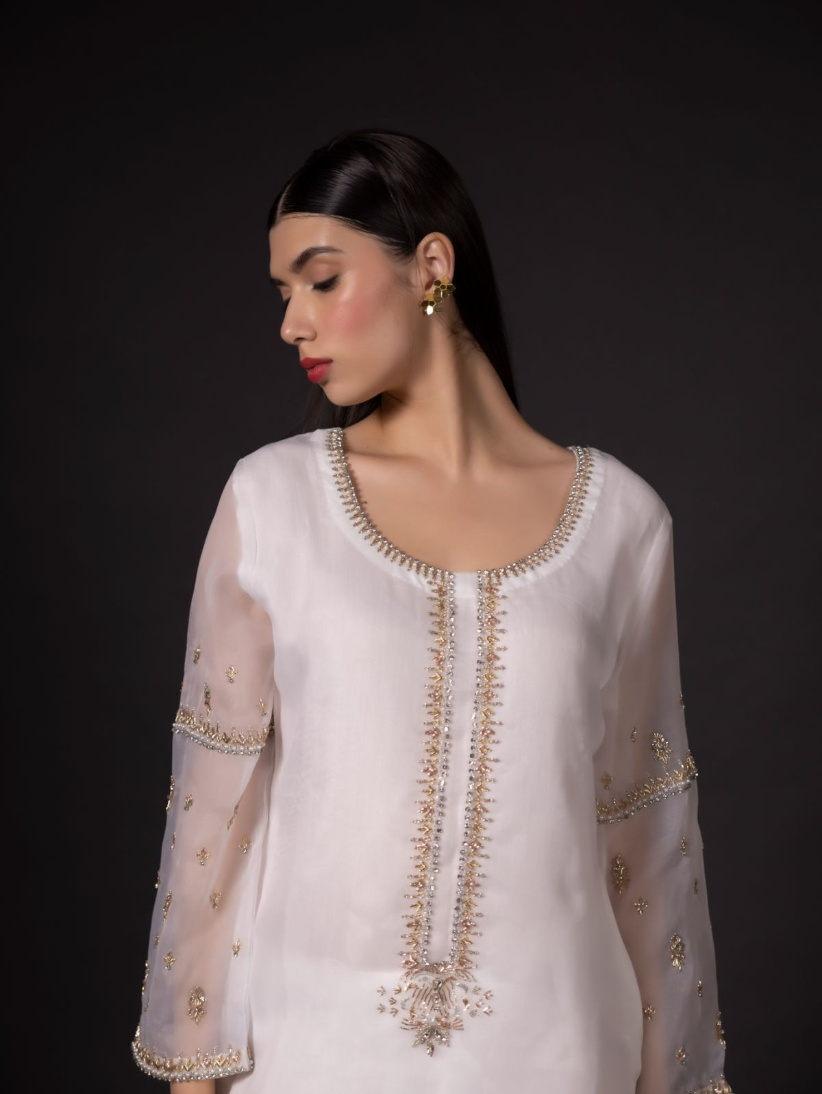 This lovely white kurta is hand embroidered with naqshi dabka sequins and crystals in two time- gold and silver. The sleeves are hand-embellished with zardosi work. The sleeves are designed to look appealing and modern. Best worn with matching pants and gold jewellery. The kurta is paired with white silk pants.