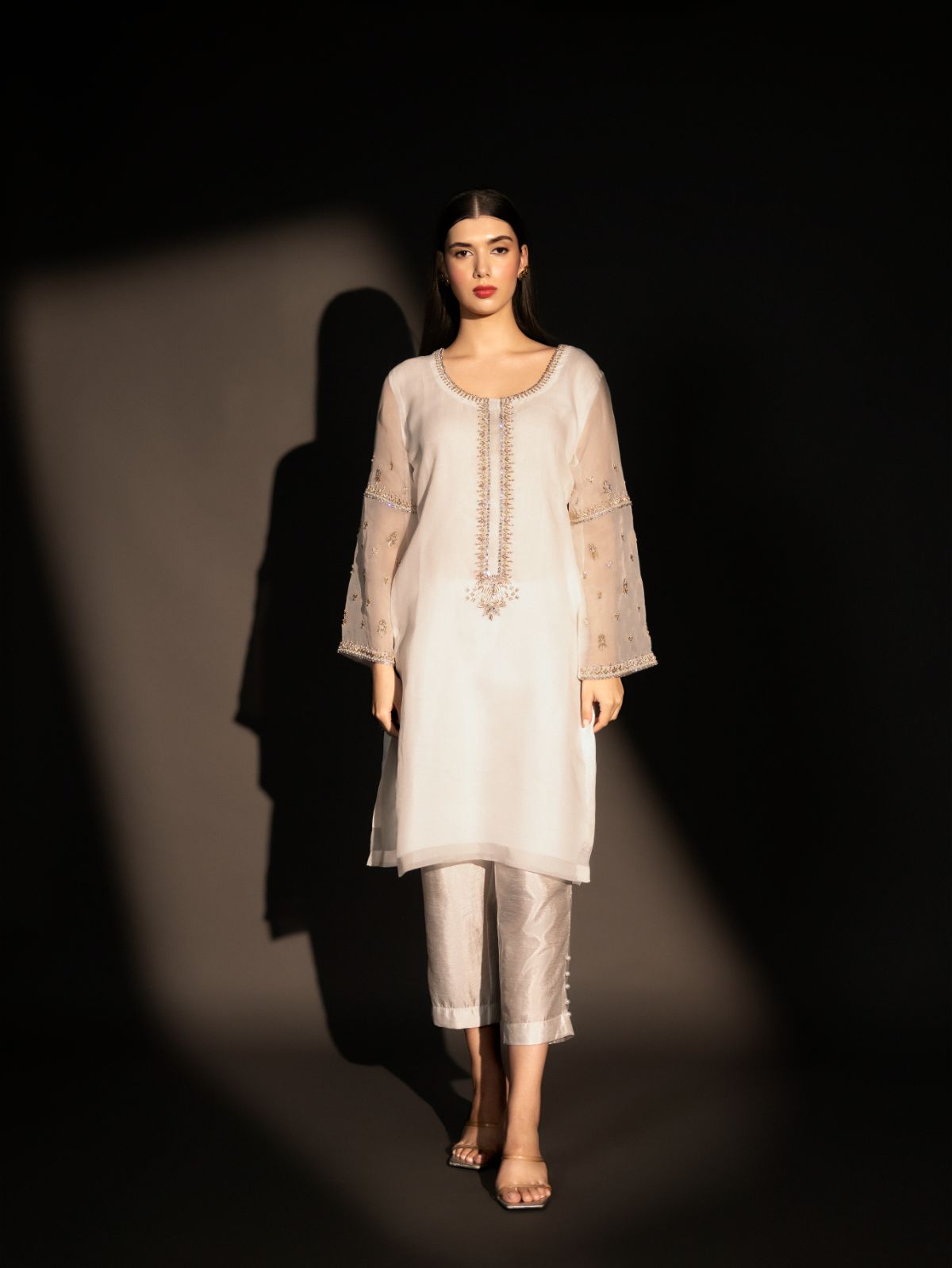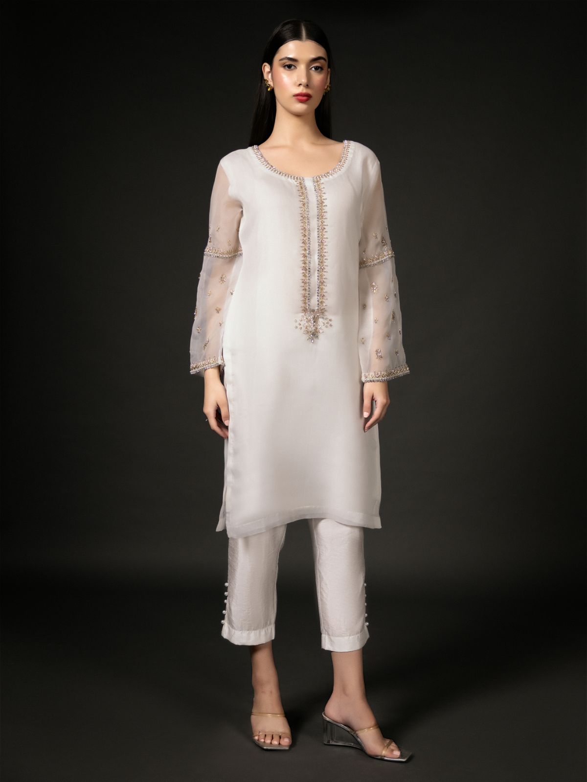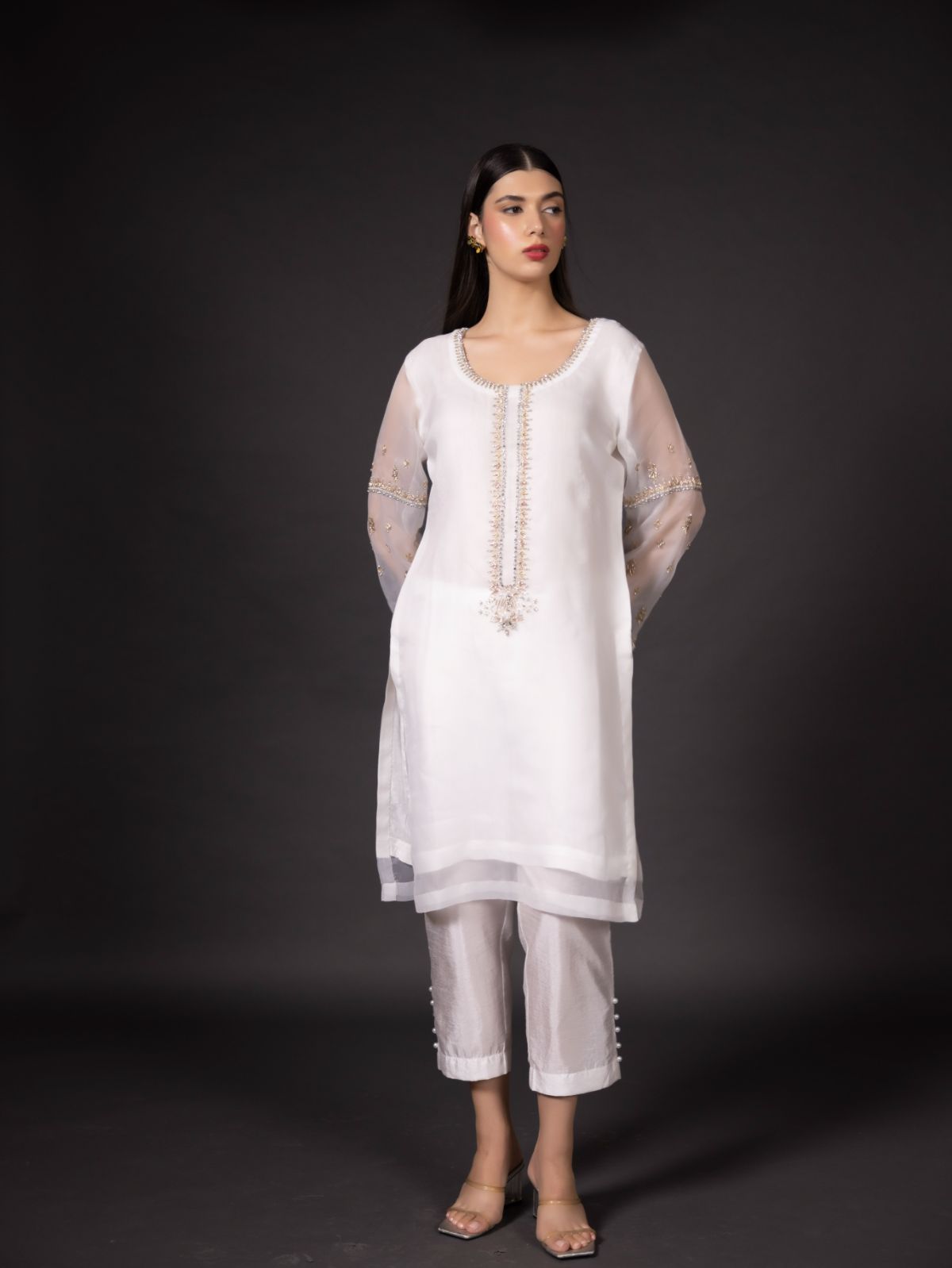 This lovely white kurta is hand embroidered with naqshi dabka sequins and crystals in two time- gold and silver. The sleeves are hand-embellished with zardosi work. The sleeves are designed to look appealing and modern. Best worn with matching pants and gold jewellery. The kurta is paired with white silk pants.