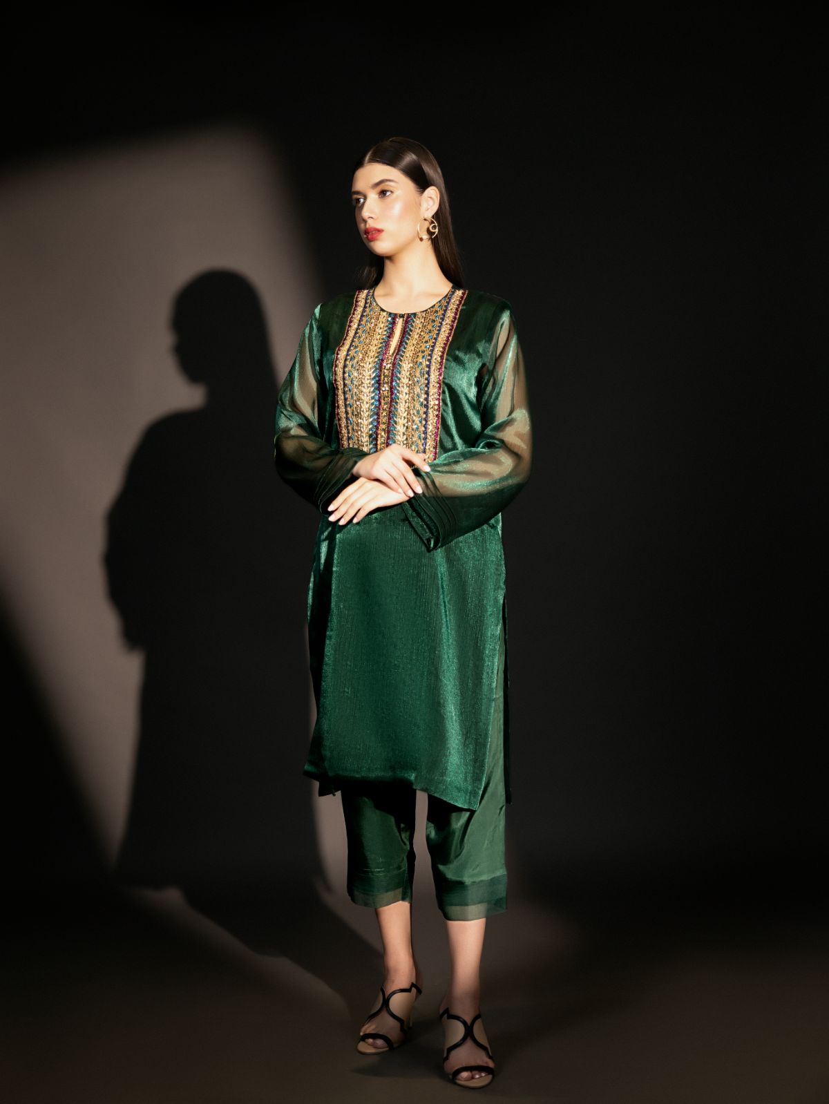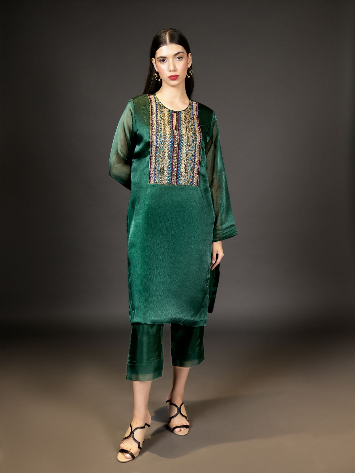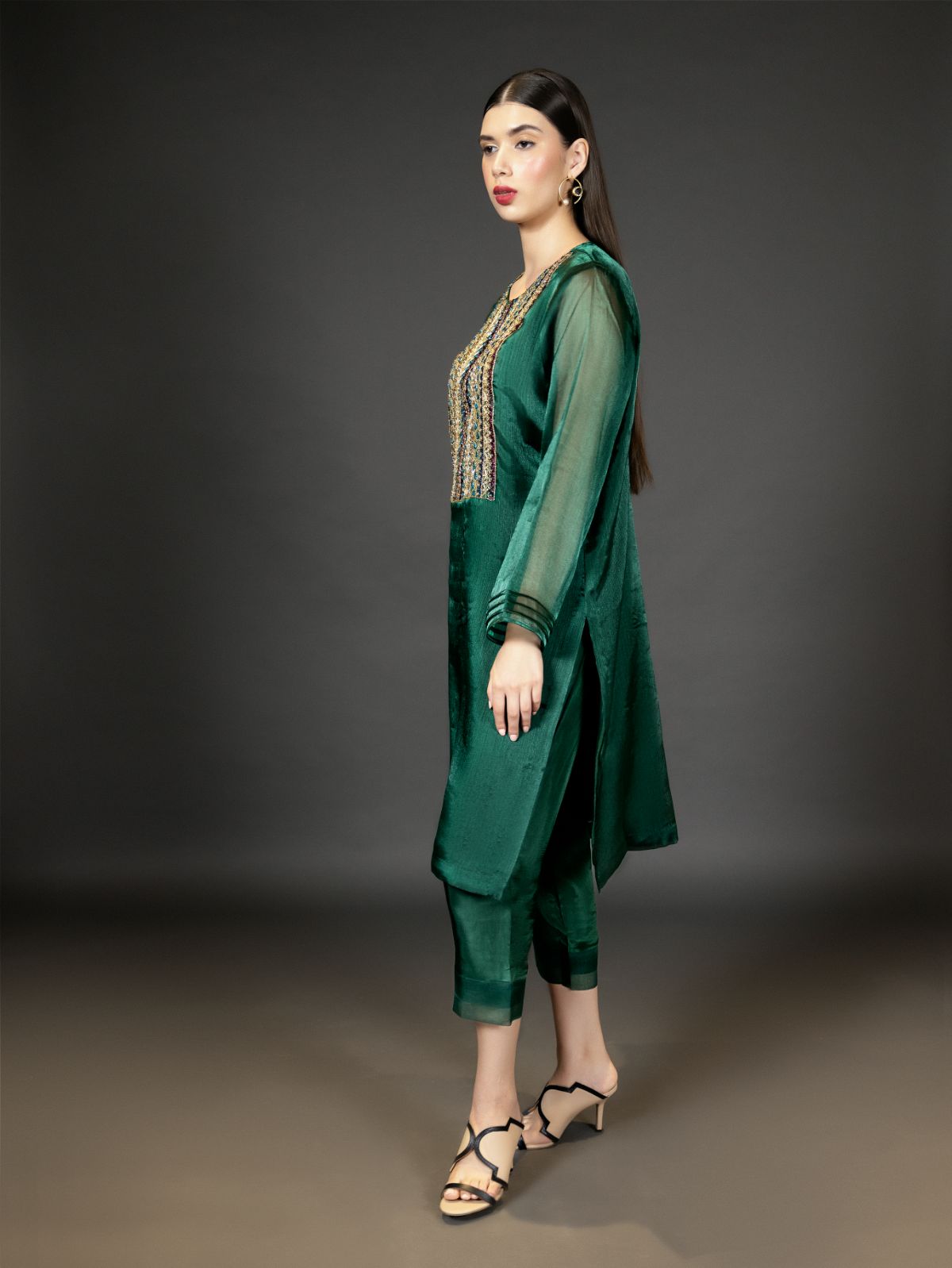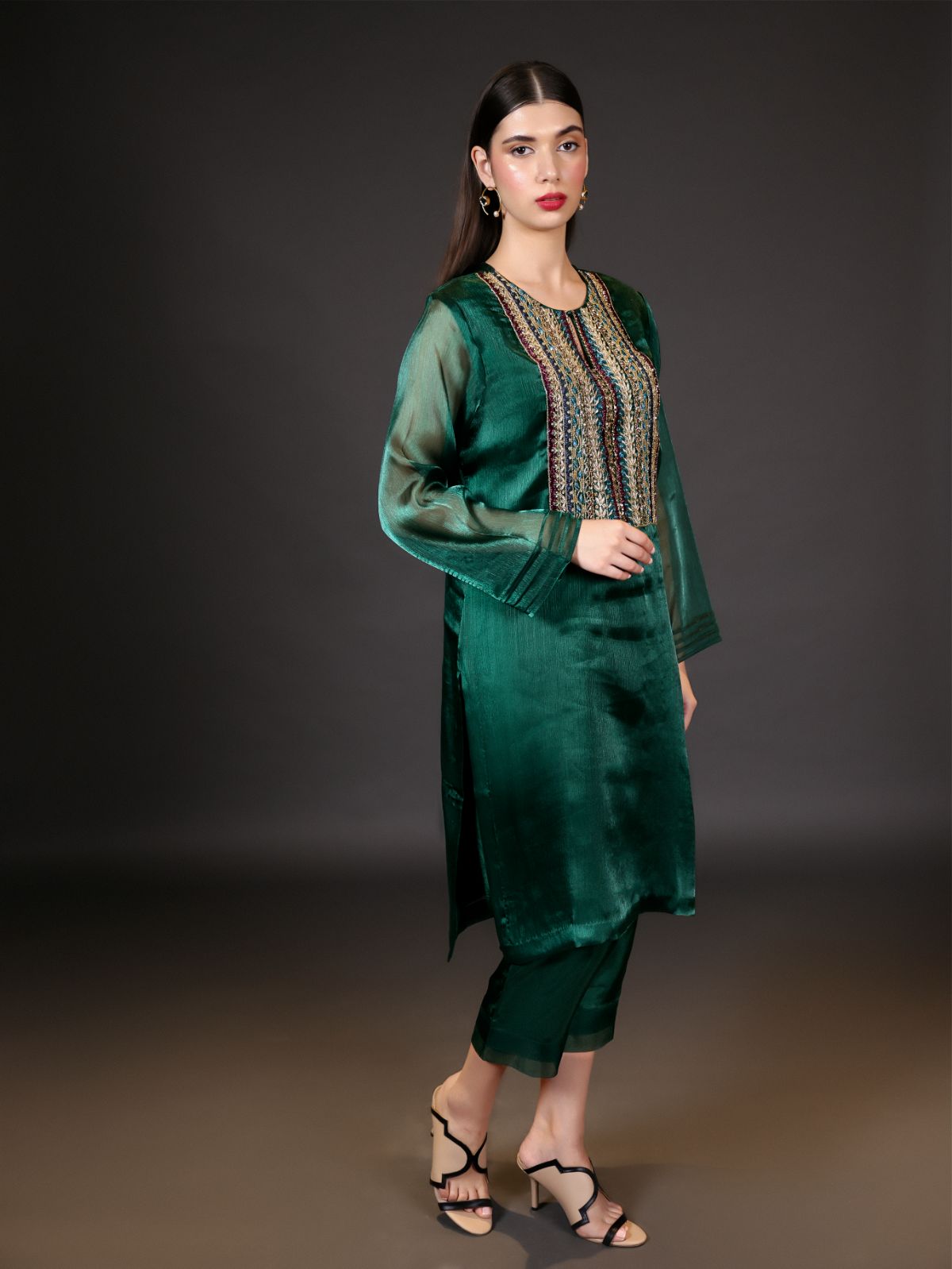 The beautiful organza bottle green kurta has heavy colourful naqshi work along with sequins, crystals, and pearls.