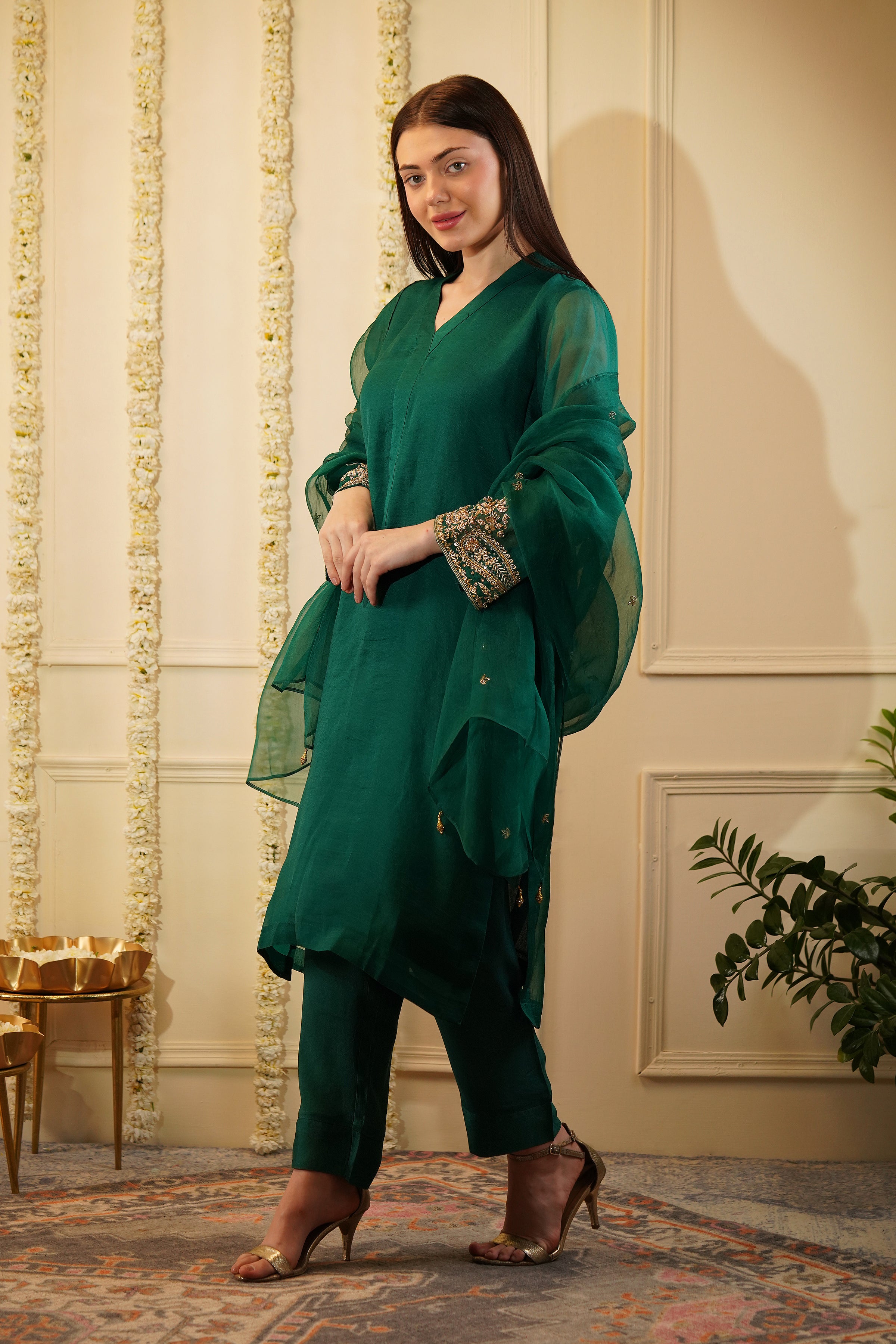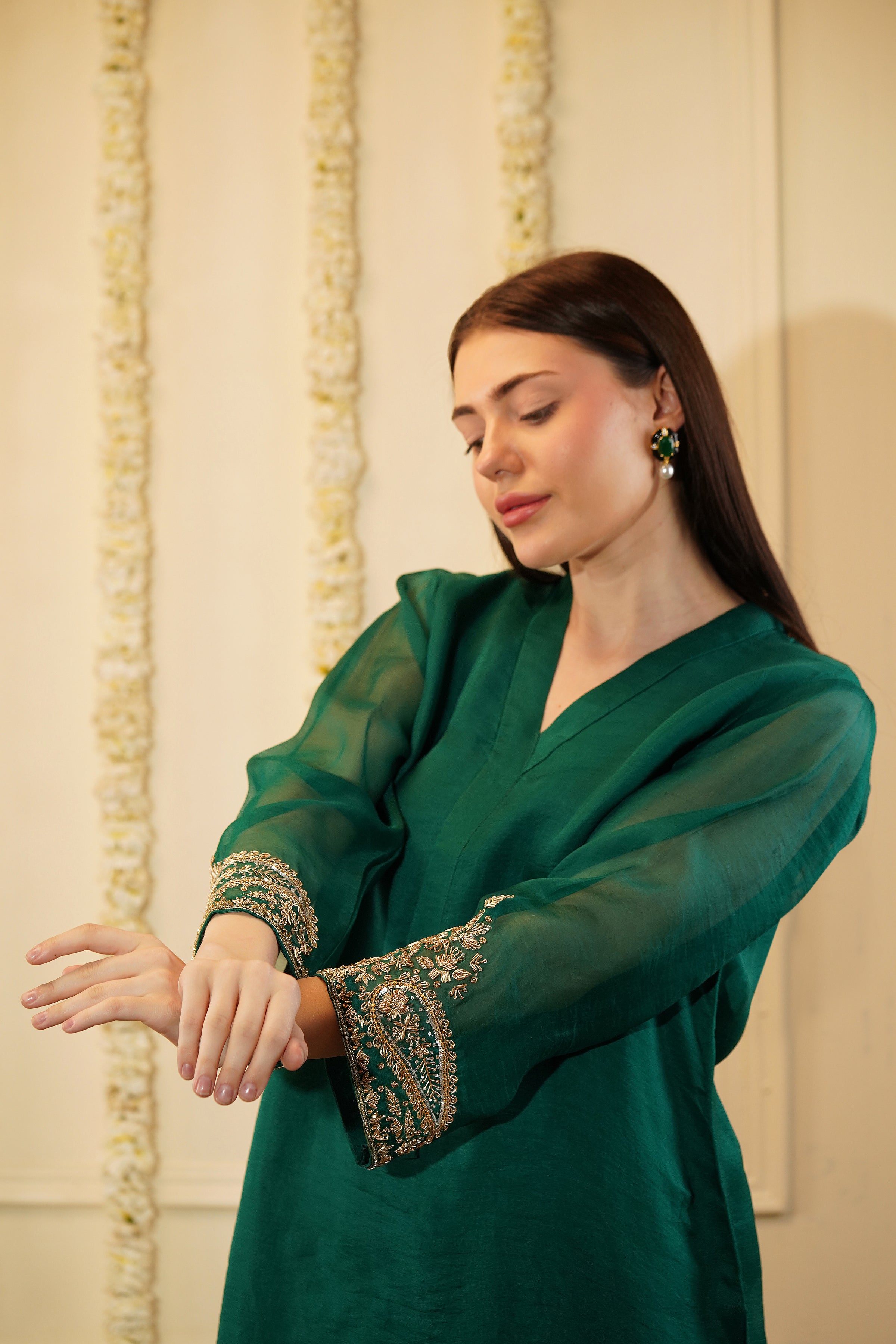 This is a dark green pure organza kurta that can make anyone look so radiant. The sleeves are hand-embellished with sequins, dabka, and naqshi in a refined manner. The entire kurta set looks very understated and yet so appealing. The dupatta comes with tassel detailing. It is best worn with matching pink pants. Perfect for evening as well as day wear.
